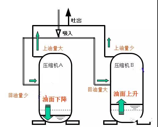 1.1、保持油面壓縮機(jī)并聯(lián)使用時(shí),由于壓縮機(jī)的上油量和系統(tǒng)回油量的的差異,長(zhǎng)久運(yùn)轉(zhuǎn)會(huì)引起壓縮機(jī)的油面發(fā)生變化(一方油面降低,一方油面上升)。如下圖: